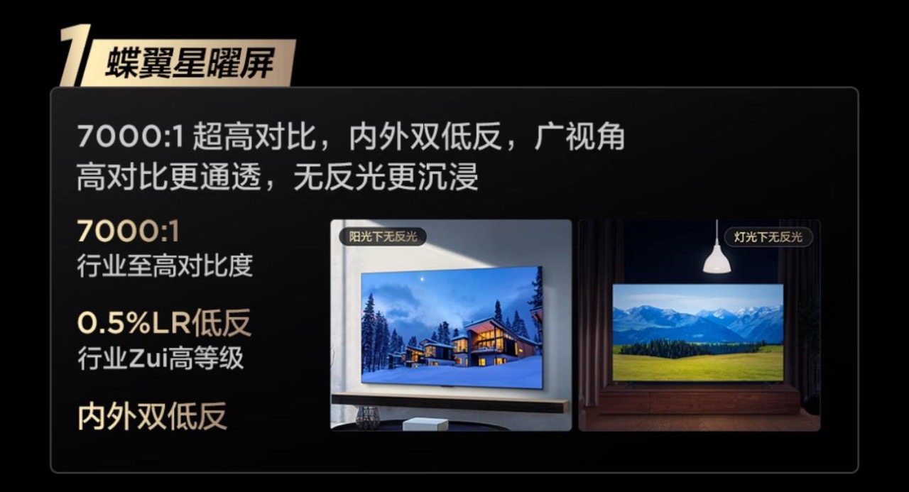 抗反光是我打开电视最先就被惊艳到的!我家客厅采光特别好,白天阳光很足,反光一直是个头疼的问题。而T7L Pro搭载的这块蝶翼星曜屏真是解决了大痛点!专业的来说,TCL通过一层行业最高等级的0.5%LR低反膜搭配内部89°液晶低反层使得整机反射率做到仅有1.8%,听起来高大上,实际效果就是抗反光能力极强!由于使用的是镜面+低反膜的方案,即使在明亮的白天不拉窗帘,屏幕上映射的窗户光影也淡得几乎看不见,画面主体依然非常清晰、通透、色彩饱和,完全没有AGLR屏(磨砂+低反膜)那种“雾蒙蒙”的感觉。