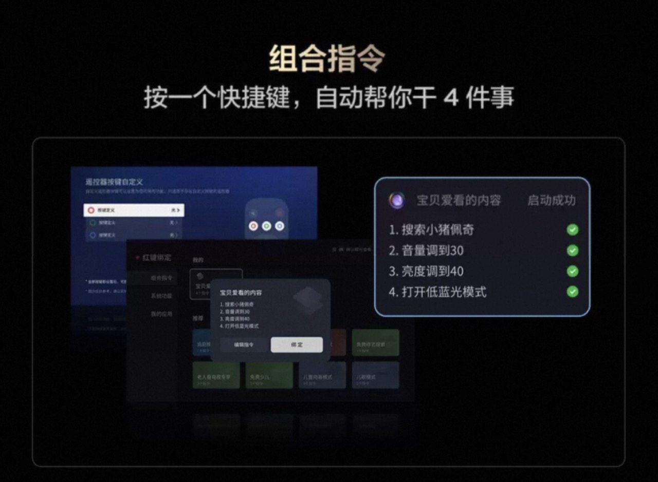 举个例子,老人想打开戏曲,然后把音量调到50、亮度调到40并且打开低蓝光模式,这里一共4个指令,是不是看着很麻烦,然而通过组合指令你就可以一步到位,将这四个指令设置到遥控器自定义快捷键的其中一个(共3个),往后老人只需要按一下遥控器上的指定按钮就能完成以上操作,是不是很方便?