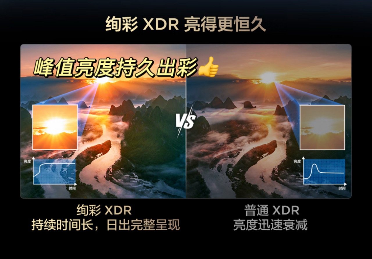 并且还拥有绚彩XDR 2200nits,看名字就带感吧?XDR峰值亮度看不少,绚彩XDR又是个什么东西?说白了,以前的峰值亮度都是瞬时峰值亮度,高亮画面转瞬即逝,而绚彩XDR技术的好处就是可以延长峰值亮度输出时间,并且由于采用了绚彩量子晶体,不会出现亮度越高画面越泛白的情况。