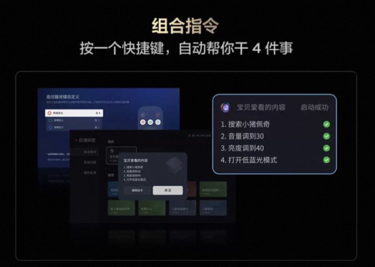 当然这里面还有个人最爱的功能那就是组合指令。听着有点玄乎,简单举个例子,平时给家里小朋友放动画片,会有惯用的亮度和声音大小,普通电视操作得先搜索动画片,接着调亮度然后再调音量等,4次操作少不了,而组合指令功能可以把4次操作配合遥控器上的自定义快捷键直接一步到位,完成以上复杂操作仅需按一个按钮即可完成,并且还提供了B站和爱奇艺的一键直达按钮,这才叫真智能电视。
