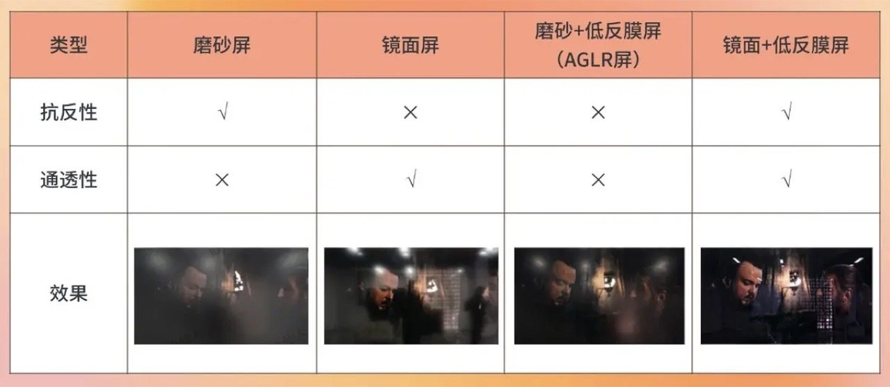 镜面屏:通透感强,画面清晰亮丽,但很容易受到环境光的干扰;
