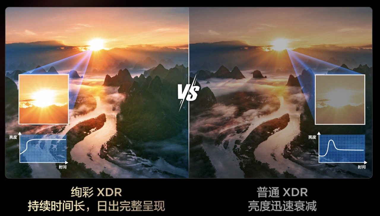 此外,针对传统显示技术在高光场景存在的亮度不足、细节丢失痛点,TCL的“绚彩 XDR” 技术融合超动态控光算法、双模驱动技术与量子点晶体,显著提升高亮场景的持续亮度表现。观看日出、篝火等场景时,画面亮度耀眼且持久稳定,带来身临其境的视觉沉浸感。