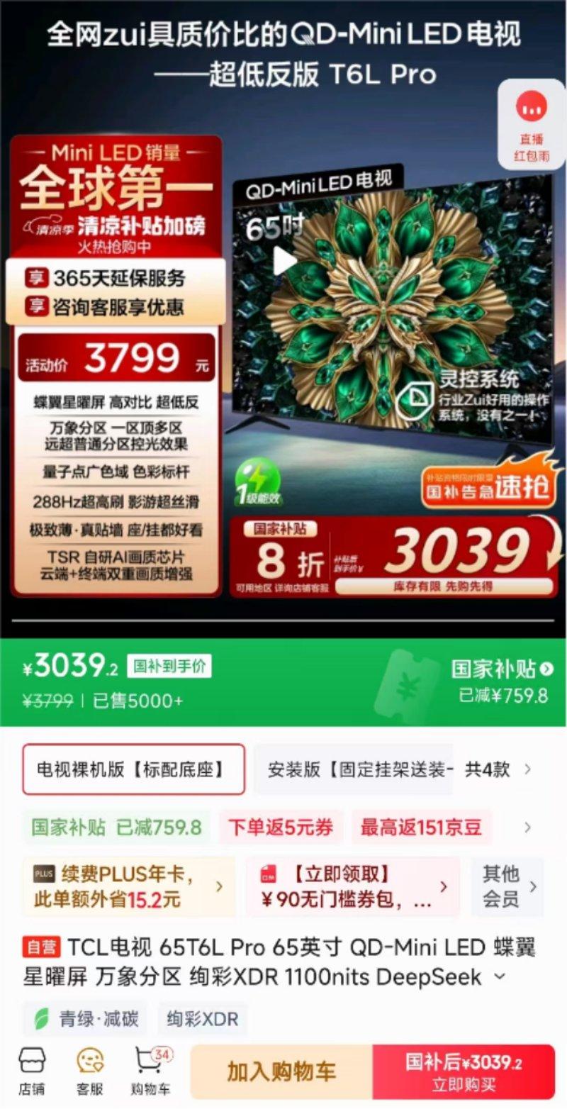 TCL T6L Pro在拥有如此出色的性能同时,价格有多亲民?近期在品牌活动及国家补贴政策的双重优惠下,65英寸实际低至 3000元这个价格带,让消费者能以较低的预算享受到高端电视的体验,真正实现“技术普惠”。