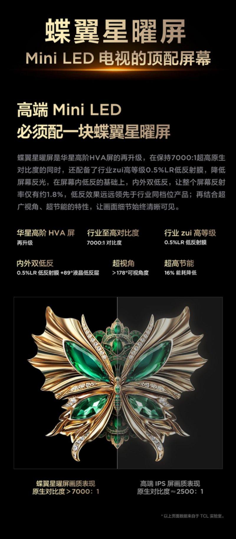 在配置方面,TCL T6L Pro最打动我的地方,就是用了原本只在去年旗舰机型中才会出现的蝶翼星曜屏,听着像玄学,其实背后全是硬科技,它通过内外双低反的设计,液晶分子的排布本身就抗光,再加上表层行业最高等级0.5%LR的低反膜,白天阳光多强,画面都不会变成一面镜子,不用拉窗帘也能清楚看清画面,晚上开灯看,也不会有烦人的倒影,画面纯净得就像在电影院里一样,观影沉浸感爆棚。