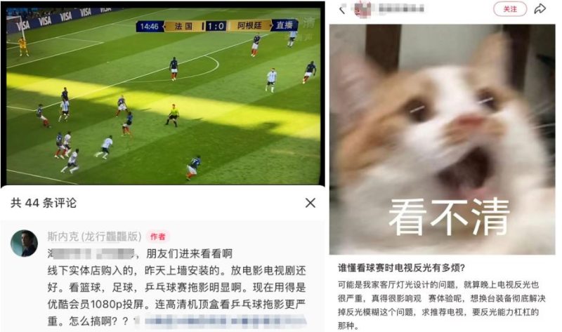 但凡用大屏看过比赛的都知道,这不是盲从潮流,而是大屏带来的沉浸式体验确实是小屏完全无法比拟的,乒乓球台前运动员手腕的精妙抖动、足球长传在空中划出的完美弧线......这些让比赛热血沸腾的细节,只有在大尺寸画面中才能被清晰捕捉。然而,选对大屏看得才叫爽感,选错了那可就是真“晦气”:反光干扰、画面不清晰、拖影严重......都让观赛体验大打折扣。