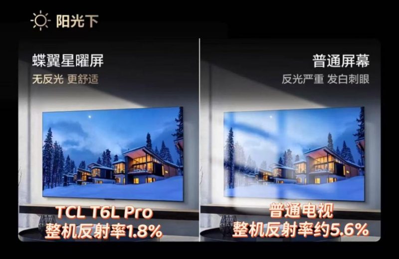 首先,面对“顽固”的反光问题,这款T6L Pro搭载的蝶翼星曜屏在过去只能在他家旗舰产品上看到,而在这款门槛价仅3000+的T6L Pro上见到实属罕见,通过一层0.5%LR低反膜搭配内部89°液晶低反层,把整屏的反射率压到了1.8%,这是什么水平?普通电视的整屏反射率一般是5.6%,这意味着T6L Pro的抗反性能起码比普通电视强出3倍,不仅显著降低了恼人的环境光反射,而且还能保持画面纯净与清晰。无论白天的日光还是夜晚的顶灯照射,电视画面都不会再受到反光干扰而影响比赛观赏。