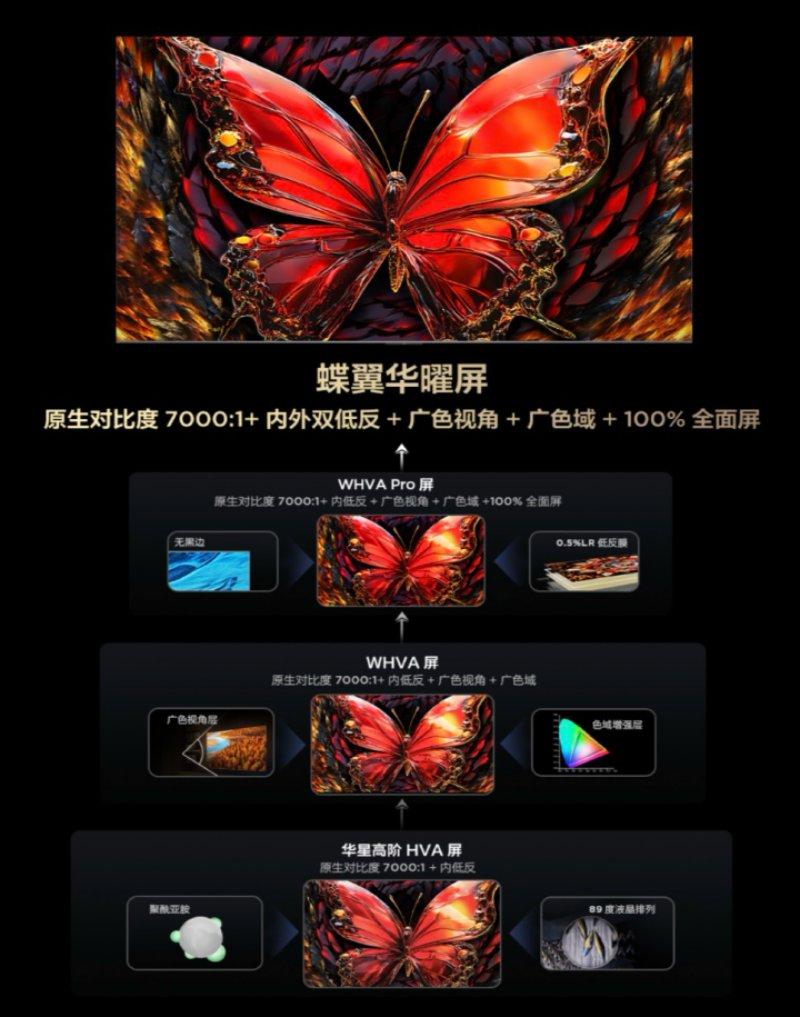 实测显示,蝶翼华曜屏的静态对比度接近7000:1,是普通IPS屏幕(1200:1)的5倍。其核心在于采用高分子材料聚酰亚胺,使液晶分子呈“蝶翼状”排列,能更精准控制光线走向。在此基础上,还加入WHVA Pro广色视角,实现了>178°的超广可视角度,即便从侧面观看,用户也能拥有“C位视角”。更关键的是,该屏幕还配备行业最高等级的0.5% LR低反膜,无论白天强光还是夜间暗场,画面都能保持纯净通透,堪称目前Mini LED电视的顶配搭档。