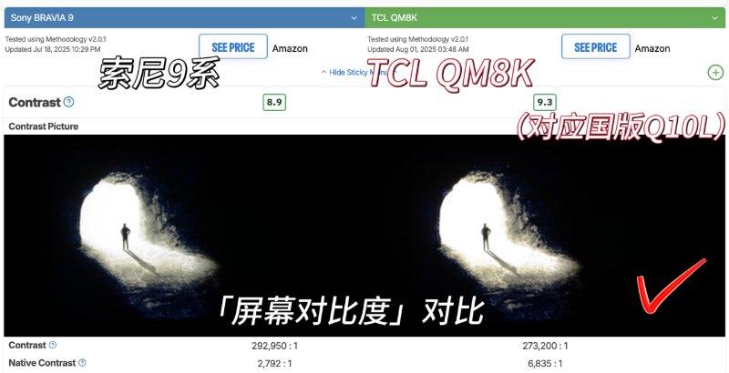 屏幕的原生对比度是决定画面层次感的基础。在这一项上,TCL QM8K再次以9.3分领先于索尼9系(8.5分)和海信U9N(8.8分)。得益于其搭载的“蝶翼华曜屏”,原生对比度实测接近7000:1的面板,约为普通IPS屏幕的五倍。高原生对比度意味着屏幕能同时清晰地呈现画面中最亮和最暗部分的细节,无论是星空中的暗淡星云,还是强光下的城市轮廓,都能保持丰富的层次感。