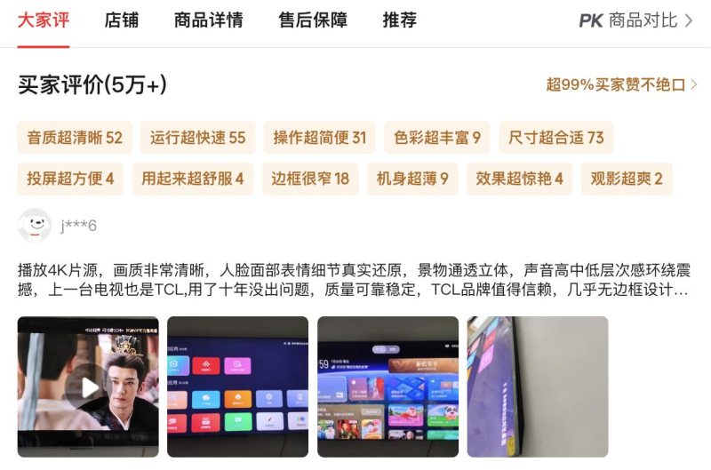 值得注意的是,QM8K在国内市场的对应型号正是TCL Q10L系列。作为TCL今年3月率先推出的行业首款第四代液晶电视,Q10L搭载了极景·无黑边设计、蝶翼华曜屏和万象分区一系列旗舰级黑科技,从外观到画质取得了重大突破。目前在京东平台上,Q10L的用户好评率超过99%,不少用户给予画质清晰、边框极窄、机身轻薄等高度评价。