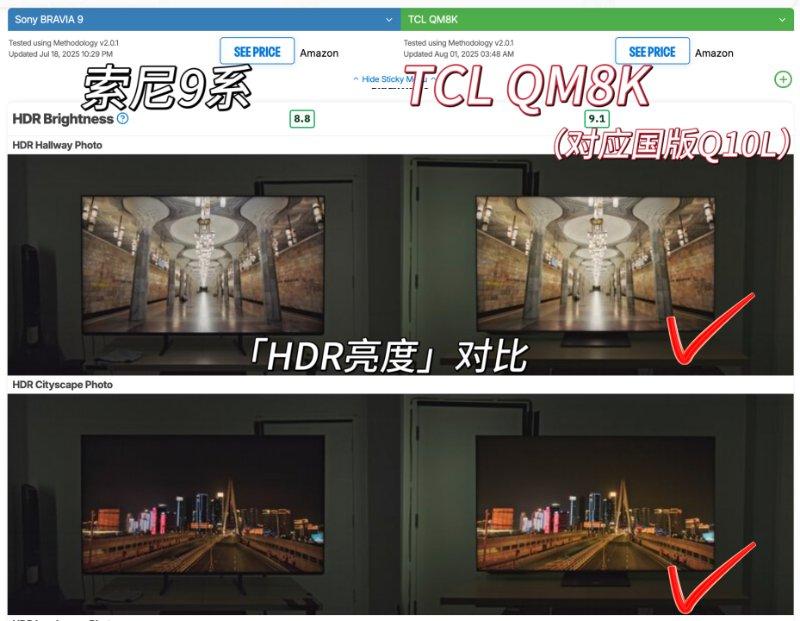 咱们先看最核心的屏幕。Rtings的评分里,TCL QM8K的屏幕对比度拿到了惊人的9.3分,而索尼9系和海信U9N分别是8.9和8.8分。可以看出,在显示最纯粹的黑色场景时,TCL就比别人更“纯净”,细节也更丰富。