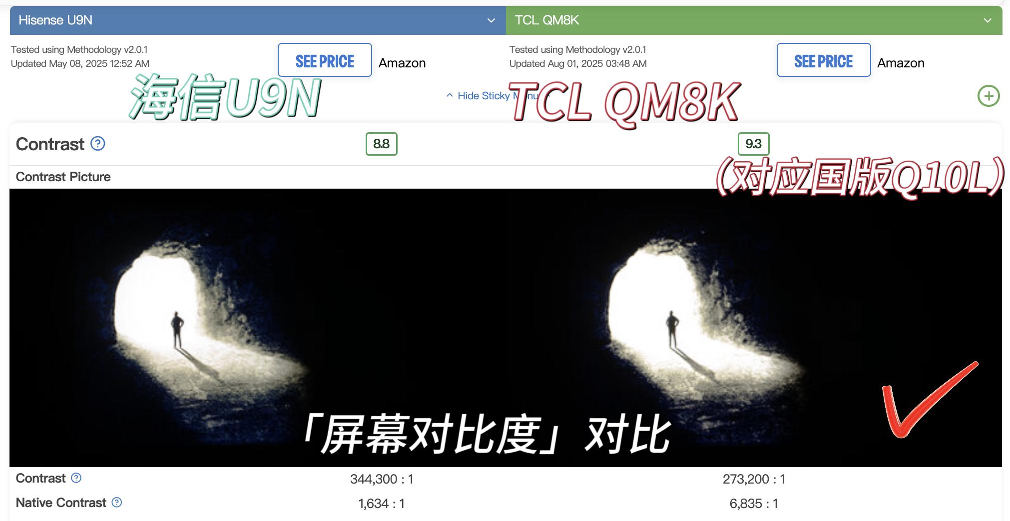 尤其在屏幕素质这一硬性指标上,Q10L用的是蝶翼华曜屏是华星HVA屏的顶配版,原生对比度直接拉到7000:1。这个数字放到实际体验里,就是暗场细节不会糊成一片,高亮部分也不会刺眼溢光,画面整体更有层次感。Rtings的实测结果也很直观,Q10L的屏幕均匀度拿到9.3分,而索尼9系是8.9,海信U9N是8.8。别小看这零点几的差距,真摆在一起看细节立刻分出高下。