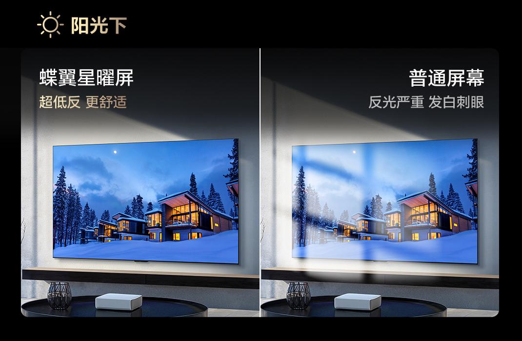 并且为了解决大屏的反光难题,蝶翼星曜屏还在屏幕上增加了一层0.5%LR低反膜,配合89°液晶低反层,内外夹击,让整屏的反射率压到了1.8%,无论是面对白天窗外的阳光亦或是晚上的灯光,画面都能依旧清晰可见,普通电视反射率一般在5.6%,又是一记降维打击。并且,如果你有巨幕电视,那么你家客厅一定会成为三五好友看球赛和看电影的首选地,而蝶翼星曜屏的广视角属性,让你再也不用担心坐在侧边上看不清楚画面。