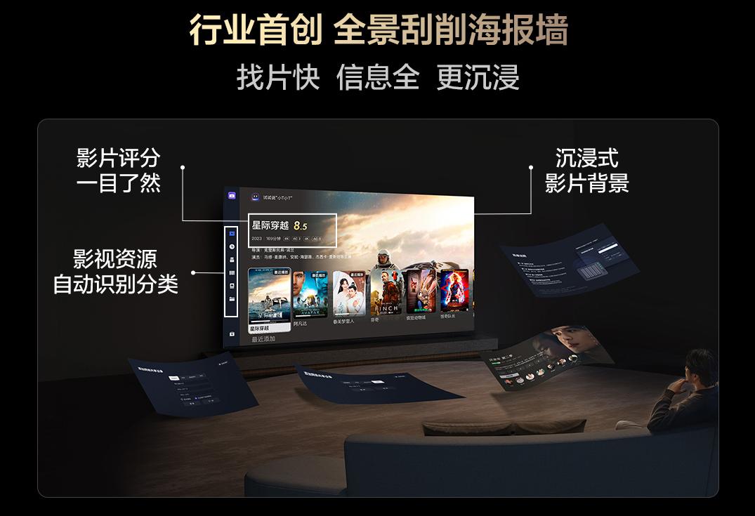 灵控系统3.0不仅把烦人的开机广告给去掉了,并且支持高度自定义桌面,这还没完,对于喜欢用大屏看电影的人来说,找片是个难题,那么这个全景刮削海报墙可谓是给电影爱好者量身定制的宝藏功能,举个简单的例子,它可以自动识别你网盘里面的影视资源,并聚合呈现在媒体中心,自动抓取生成海报封面、影片评分、演职员信息等内容,选片一目了然,轻松搞定。