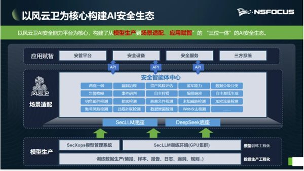 2020年至2022年,绿盟科技连续发布三部AI安全白皮书《安全AI赋能安全运营白皮书》、《知识图谱白皮书》和《AI安全分析白皮书》,并于2023年推出“风云卫”安全大模型,深度融合AI与攻防知识。2025年,公司再度升级,构建“风云卫+DeepSeek”双底座与多智能体架构,打造AI驱动的安全生态,覆盖模型生产、场景适配与应用复制三大层面,全面提升安全检测、运营、数据安全及蓝军对抗能力,实现全域智能赋能。