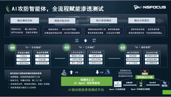 此外,还正式发布了“绿盟AI智能化渗透系统”,该系统依托AI技术全面赋能渗透测试全流程,可广泛应用于常态化扫描和日常安全运维等场景,有效帮助客户降本增效,显著降低渗透测试的专业门槛。