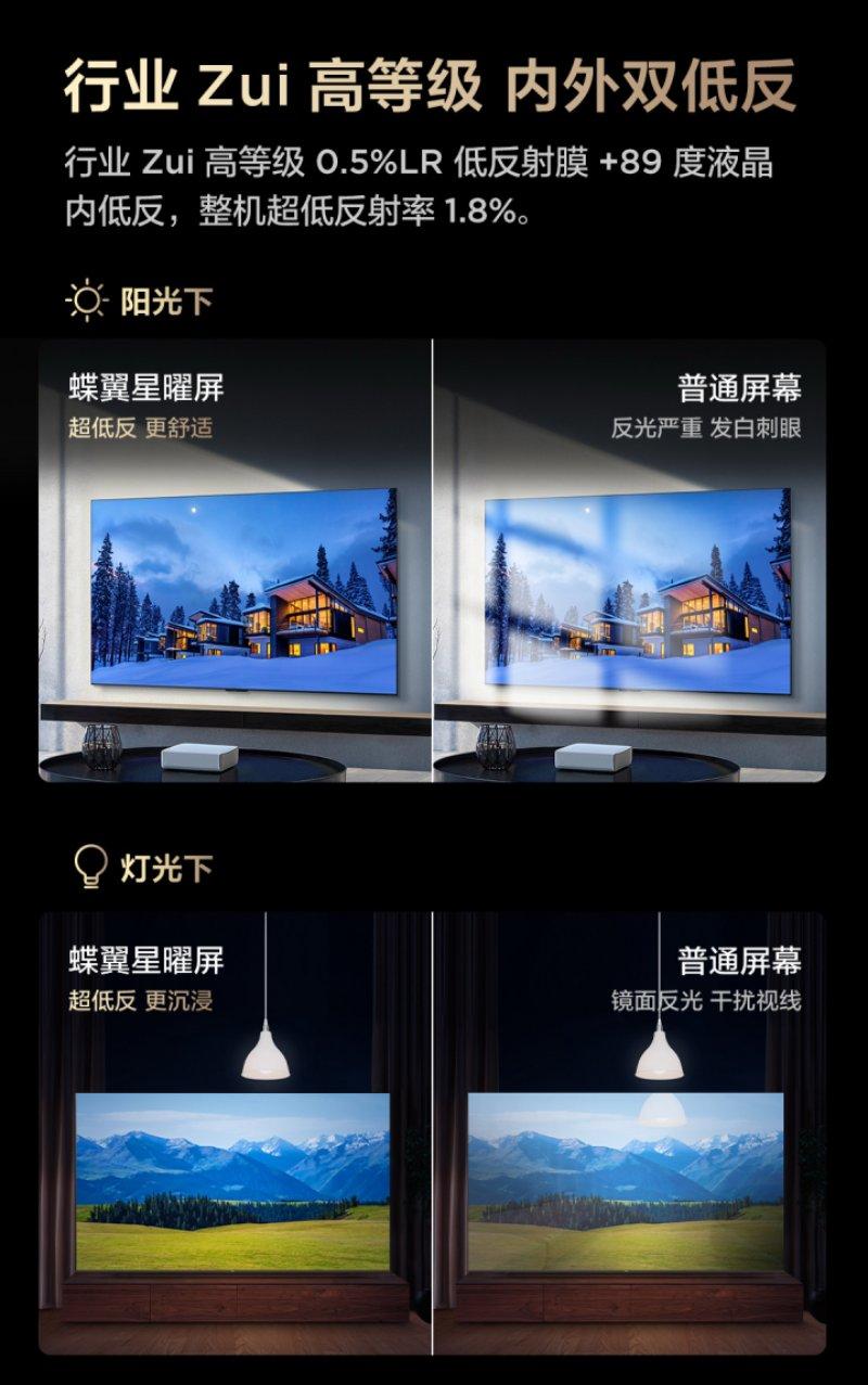 面对用户“强光下看电视反光泛白”的痛点困扰,TCL T7L Ultra给出了针对性解决方案。它所配备的蝶翼星曜屏,采用创新的镜面+低反屏组合设计,通过行业最高等级的0.5%LR低反膜,配合呈85度规律排布的液晶分子,成功将整机反射率控制在仅1.8%的超低水平,从而大幅削弱环境光对画面的干扰。即便白天阳光直射或夜晚灯光明亮的客厅,屏幕画面也能始终保持清晰纯净。