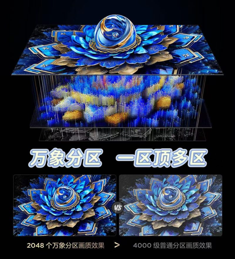 而T7L Ultra采用的独门杀手锏“万象分区”技术——这是一套全链路的Mini LED系统级控光方案,该技术从背光到成像,通过发光芯片、透镜技术、OD设计等7大底层技术优化,实现 “一区顶多区” 的控光效果。像它至多搭载2048个万象分区,画质效果却能媲美市面上4000级普通分区的电视。