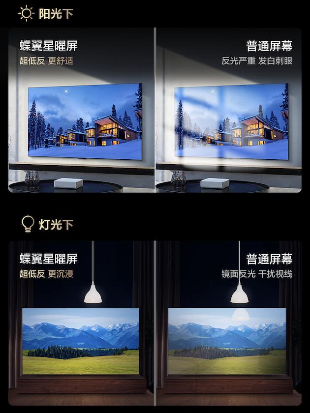 相信很多人家里的电视跟我的旧电视一样,总是容易出现反光。前几年市面上普通的中端甚至是中高端电视,基本都配置的是不带低反的镜面屏。而现在市面主流有两种抗反光方案:AGLR(低反+磨砂)方案和镜面低反(LR低反膜+镜面HVA屏)方案,AGLR方案目前能做到2.6%的整机反射率,算是比较先进的,但因为采用磨砂膜导致画面清晰度和色彩通透感会牺牲一些。