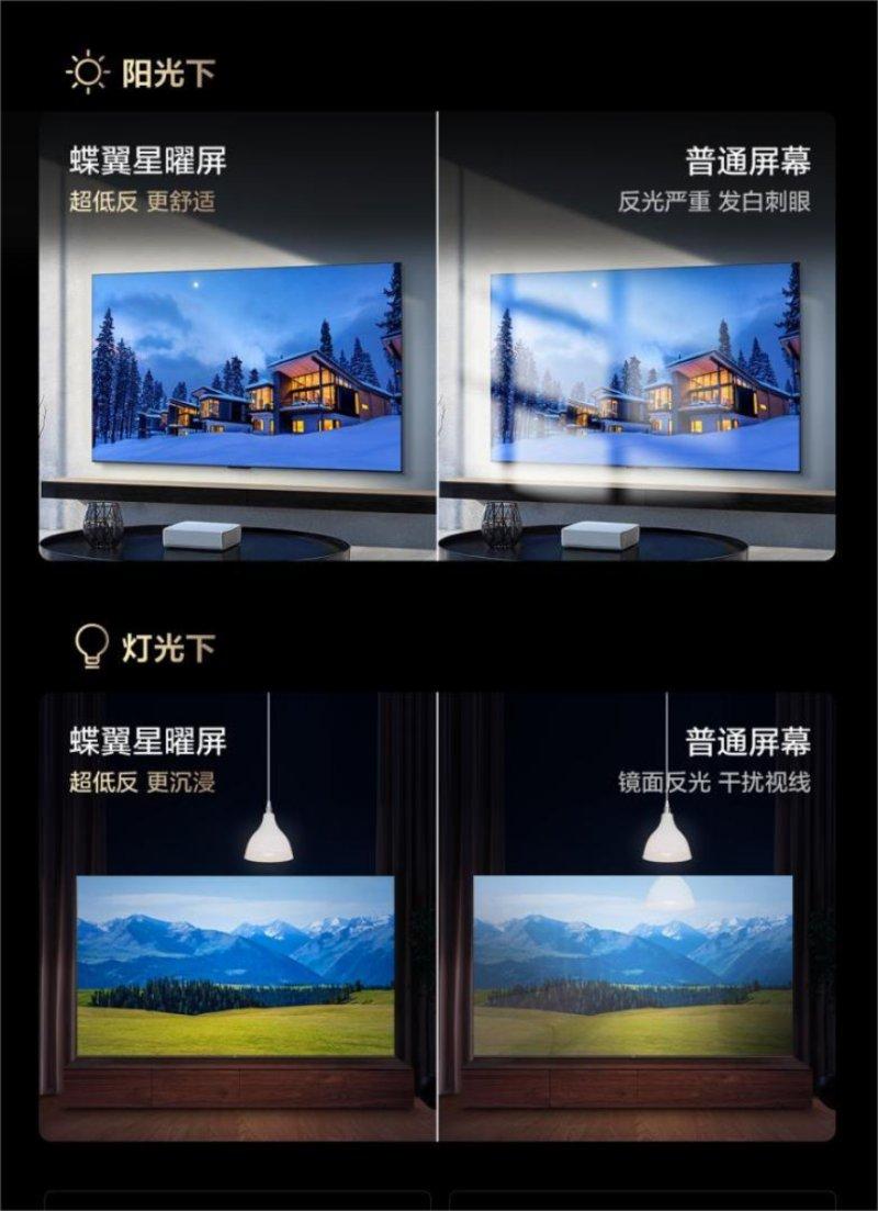 如果你家里白天采光特别好,或者经常开灯看电视,这款电视就特别适合。白天光照强烈,夜晚室内灯光打在屏上,这台电视几乎看不到任何泛白或倒影。我查了一下资料,它用的是“镜面低反”方案,屏幕外层采用行业最高等级0.5% LR低反膜,搭配89度液晶内低反,形成内外双低反,整机反射率只有1.8%。相较于市面上另外一种抗反方案AGLR方案,其采用低反+磨砂膜,整机反射率也仅仅只能做到2.6%,且磨砂膜还会降低画质呈现。所以说T7L Ultra的镜面低反屏是画质最好的屏幕,在保持了屏幕的对比度、画面通透性的同时,大幅降低环境光的干扰。
