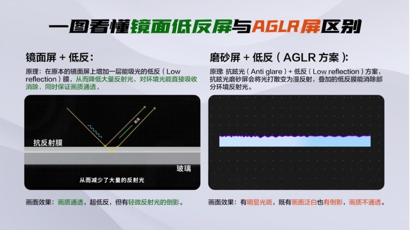说到底,电视反光的核心症结,就在于屏幕技术。普通电视的“镜面屏”,如其名就像一面镜子,会把所有光线都反射回来。虽然市面上有非常多抗反光产品,但是很多品牌由于技术限制、或者成本管控等原因,采用的是AGLR低反(低反+磨砂结合)方案。这种方案将反射率降低至2.6%,但是磨砂质感带来的对比度折损仍让画质表现留有遗憾,所以算是一种妥协的方案。
