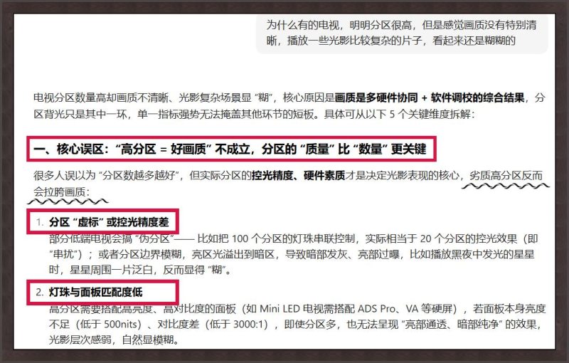 接着咱们再来说说控光,为什么我之前的电视明明分区不低,看电视就是感觉不够得劲呢?这个我还是问了下豆包才知道,分区不是只看数量就好了,得看控光精度有没有跟上,如果一味增加分区数,反而会增加控光难度,这个时候如果底层技术没跟上,则控光精度不够,就容易造成分区间溢光,最直观的就是,看一些光影复杂的片子画面会有明显“光晕”。