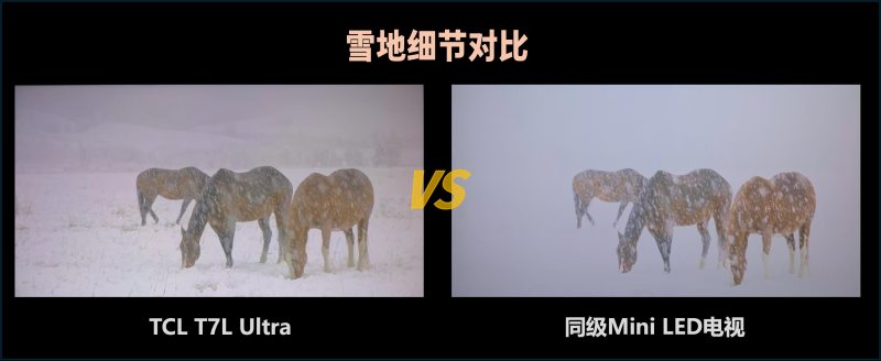选购过程中,背光分区也是我重点考察的指标,毕竟它是影响Mini LED电视画质的关键因素之一。了解后发现,TCL T7L Ultra搭载了自研的“万象分区”控光技术,这套系统级Mini LED控光方案从发光芯片到屏幕显示的全链路7大核心环节都做了优化,实现了“一区顶多区”的出色控光效果。以我入手的98英寸版本为例,它配备2048级万象分区,实际控光表现甚至优于部分拥有4000级普通分区的电视。比如播放雪地场景画面时,TCL T7L Ultra能清晰呈现远方景物的轮廓细节,而普通电视的画面则一片惨白,细节完全被掩盖。