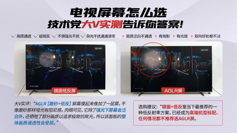 可我家那台用了好几年的旧电视,却总在关键时刻掉链子。下午阳光透过窗户照在屏幕上,满屏都是光斑,球员的跑动路线都看不清楚,好好的观赛心情全被搅乱了。忍了几次关键赛事看不清的遗憾后,我下定决心换台新电视,首要目标就是解决反光问题。做功课的时候发现,目前市面上针对反光问题有不同的解决方案,其中AGLR屏主要靠屏幕表面的磨砂处理来散射光线,虽然能在一定程度上减少反光,但看久了会发现画面会蒙上一层淡淡的雾感,色彩不够鲜亮,侧视时还容易出现泛白现象,而另一种镜面低反技术优势在于既能有效控制反光,又能最大程度保留画面通透度,不会让画质打折扣。