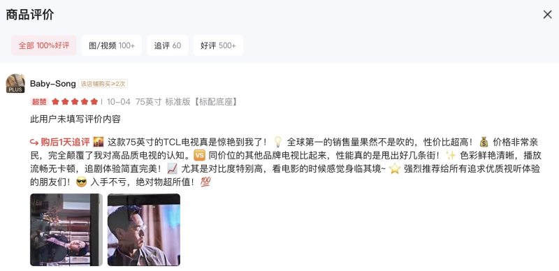 对比多款采用不同方案的电视后,TCL T7L Ultra的镜面低反设计让我颇为关注,它在抗反和画质之间实现了较好的平衡,成为我双十一换机清单中的优选。而且从电商平台的用户反馈来看,这款电视的抗反光效果和画质表现普遍获得认可与称赞,其综合实力也因此得到了更充分的印证。