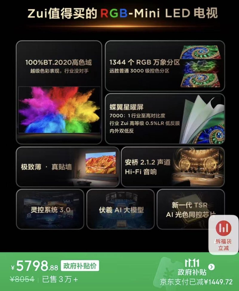 除了解决色衰问题,更关键的是成本也降下来了。因为蓝色芯片量产成本更低,光学材料的工艺也更成熟,所以 Q9M 直接把价格定在了万元以内,成了全行业首台万元内的 RGB-Mini LED 电视,65吋版本国补后不到6000元,75 吋也才7000 多,比传统 RGB 电视便宜近一半,普通家庭的预算完全能 hold 住。