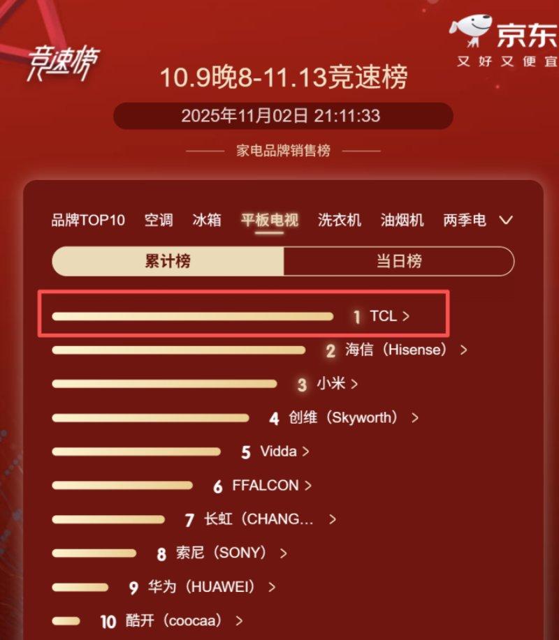 今年双十一的市场表现也给出了有力的回应:TCL在电视品类中持续领跑销量榜单。这份亮眼的销量成绩的背后,本质上是消费者对SQD-Mini LED技术的高度认可,也是其解决行业痛点获得市场反馈的直接体现。