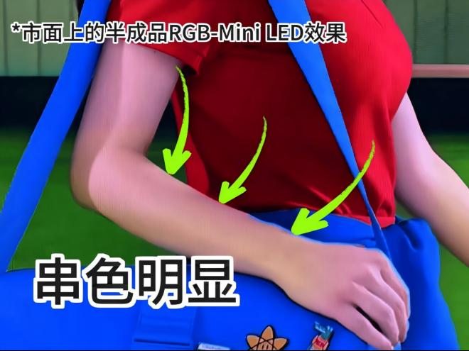 在今年的显示技术领域,肯定绕不开两个名词:RGB-Mini LED和SQD-Mini LED。两者虽同属Mini LED阵营,但技术路径与最终效果却有着显著差异。先说说RGB-Mini LED,它是今年才量产的技术,主打的就是“色彩鲜艳”,宣传说能达到100% BT.2020高色域,听着挺厉害,单看大范围纯色画面时,颜色确实挺亮眼。但一碰到色彩复杂的场景,致命问题就暴露了:常常出现串色、偏色和色晕等问题。比如下面这张照片,在手臂和衣服交界处的颜色模糊不清,边缘颜色甚至会晕在一起。说白了,它就是单纯堆了色域,却没解决色彩稳定性的问题,所谓的“高色域”也就只能看个简单画面,一到电影里的复杂场景就歇菜,根本满足不了咱们追剧看片的需求。