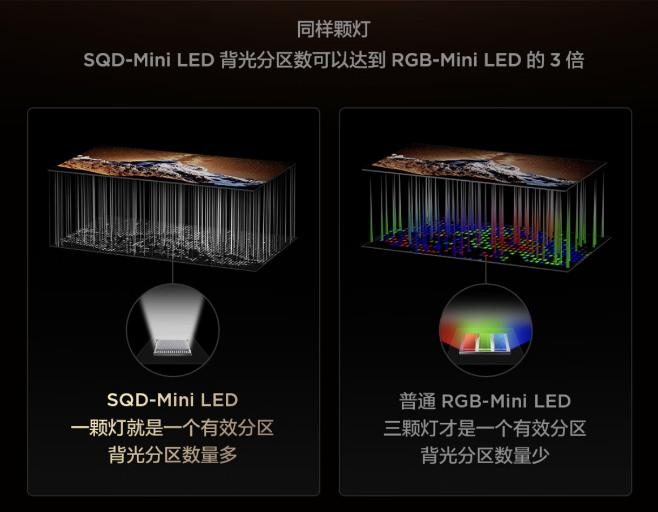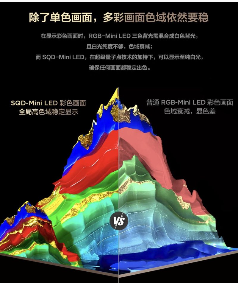 可咱们对画质的追求哪儿有尽头?QD-Mini LED慢慢也满足不了大家对更高对比度、更广色域的极致需求,于是行业里分化出两条技术路线:RGB-Mini LED 与 SQD-Mini LED。这两条赛道至今讨论度都很高,双方都打着 “高对比度”“强画质” 的旗号各说各理,把不少想追好画质、好色彩的消费者绕得晕头转向,挑电视挑得眼花缭乱。所以今天就来给大家好好聊聊这两种技术,避免大家花高价买“闹心”回家。