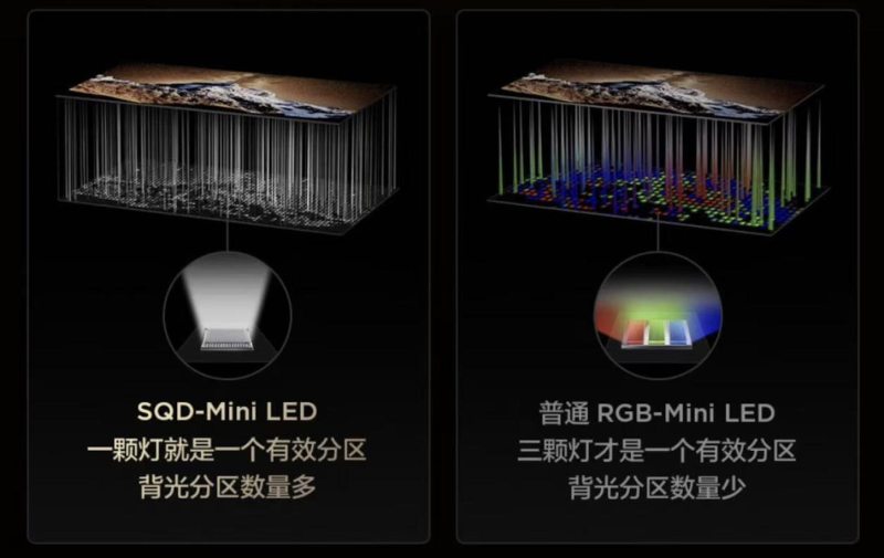 相比之下,作为Mini LED技术的领先品牌,TCL今年推出的SQD-Mini LED技术在画质上实现了全面超越。在同等成本、尺寸下能做出更多控光分区,不管是画面细腻度,还是明暗对比的精准控制,都提升明显。