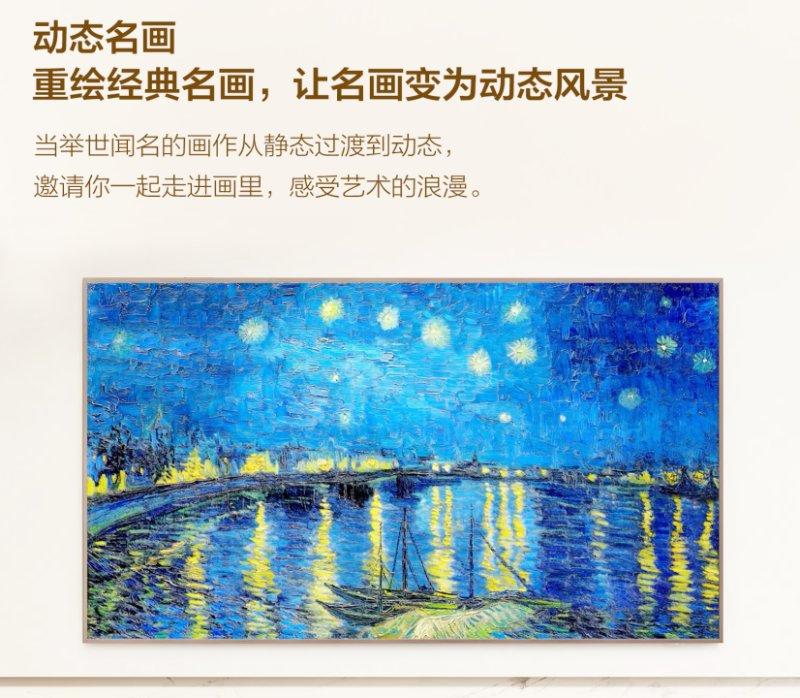 光是外表好看还不够,要我说,关掉节目后,A400 Pro的艺术潜能才真正释放。一方面它内置上百幅免费世界名画,印象派大师、现代艺术、抽象几何、自然风光等类型壁纸应有尽有,待机即可切换为私人艺术展厅。此外,还有动态名画功,比如让梵高的星空流动起来,静态杰作立马“活”了过来。想要拥有自己专属的艺术作品也能得到满足,通过AI艺术功能,仅需输入3个关键词,3秒就能生成专属画作。