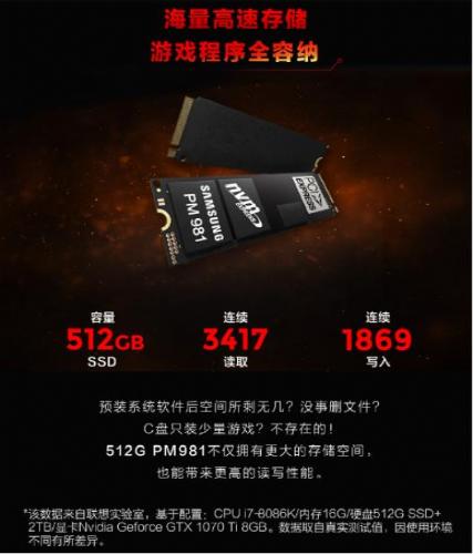 更值得一提的是,拯救者刃9000II还搭载了512GB NVMe PCIe3.0 PM981 高速固态硬盘,连续读、写速度分别达到3300+/1800+,让玩家可以在这个全民SSD时代中,拥有更海量的存储空间和更快的存储速度,免去频繁清理磁盘的烦扰,游戏程序全容纳,更新再多也不怕!