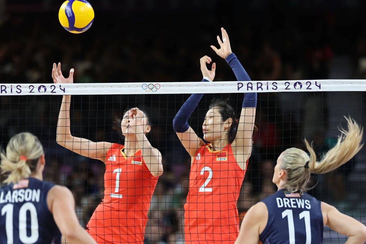 7月29日,中国队球员袁心玥(中左)、朱婷(中右)在比赛中。当日,在巴黎奥运会女子排球小组赛中,中国队对阵美国队。新华社记者 李钢 摄