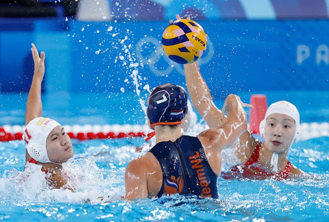 7月29日,中国队球员邓泽文(前)在比赛中攻门。当日,在巴黎奥运会女子水球小组赛A组比赛中,中国队11比15不敌荷兰队。新华社记者 张玉薇 摄