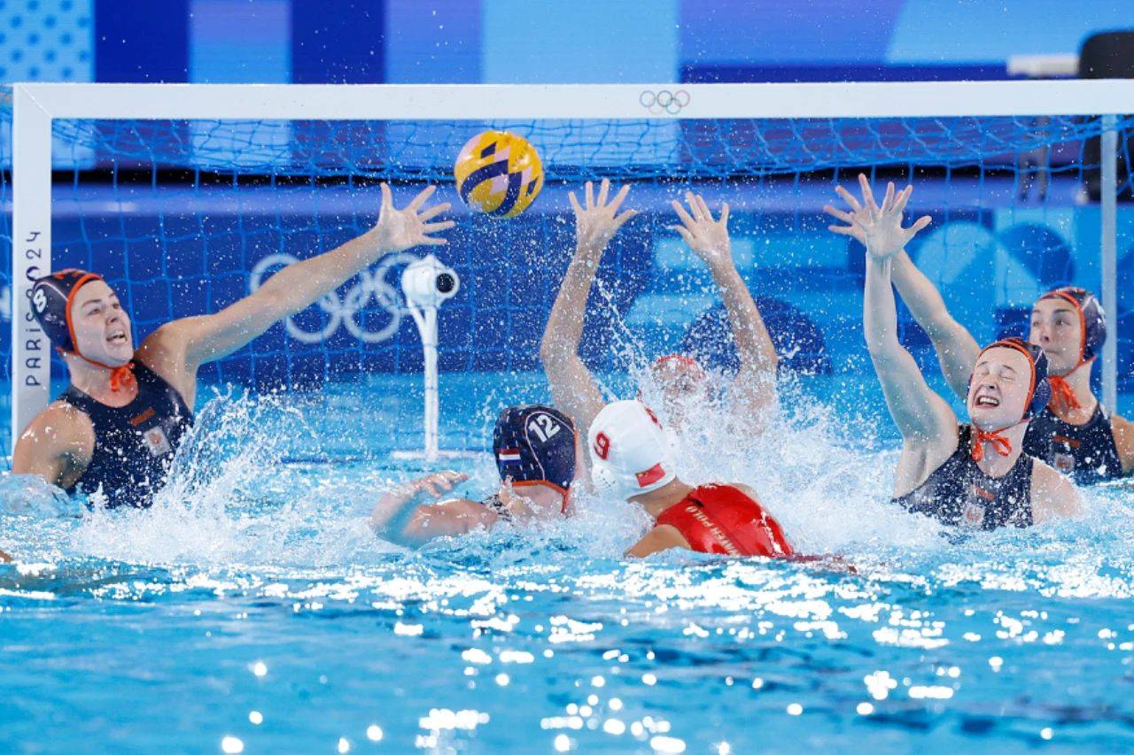 7月29日,荷兰队球员本特·罗格(中)在比赛中进攻。当日,在巴黎奥运会女子水球小组赛A组比赛中,中国队11比15不敌荷兰队。新华社记者 张玉薇 摄