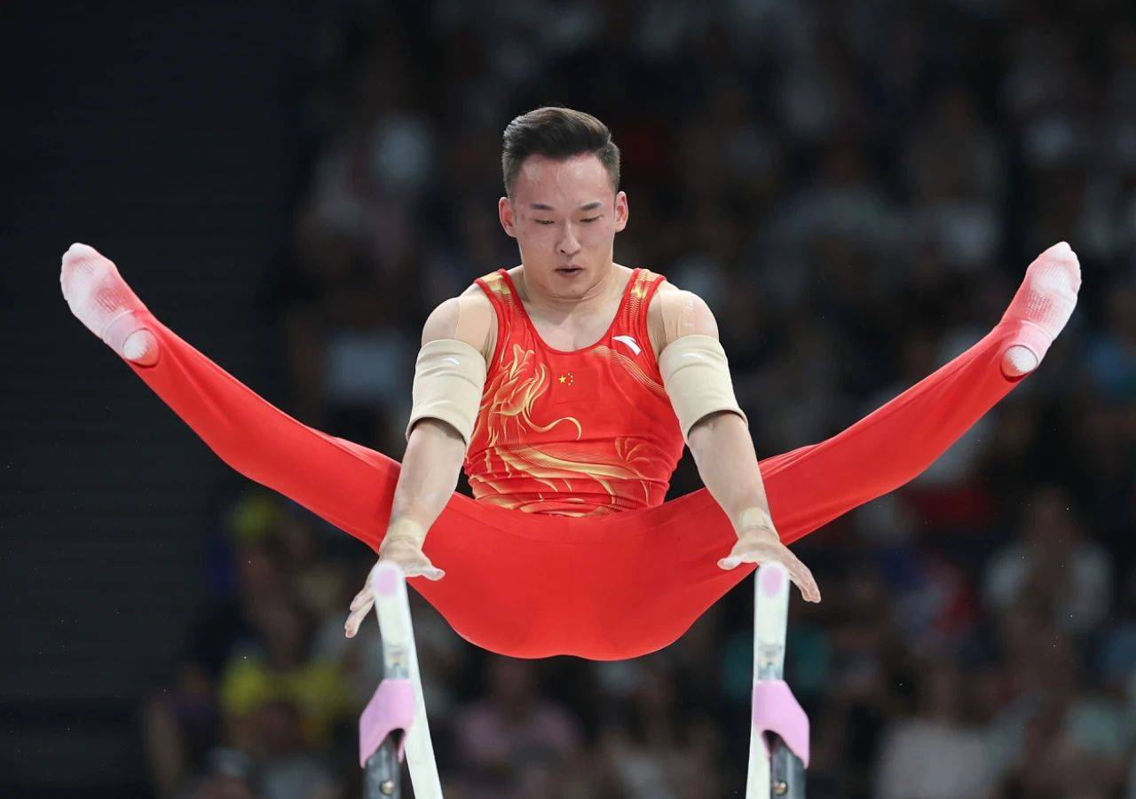 7月31日,中国选手肖若腾在双杠比赛中。当日,在巴黎奥运会体操男子个人全能决赛中,中国选手张博恒获得亚军、肖若腾获得季军。新华社记者 曹灿 摄