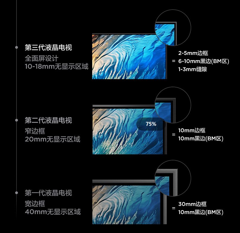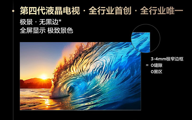 第四代液晶电视到底和之前的其他电视有什么区别么?首先,外形工艺上可谓是达到了空前绝后的程度!第一代液晶电视因工艺限制,屏幕四周存在明显黑边,普遍宽度10mm左右。第二代略有改善,但是也有2-5mm,看上去还是有局限感。来到第三代虽然进一步缩减的黑边,但是加上边框和缝隙,还是称不完全称得上是“全面屏”。