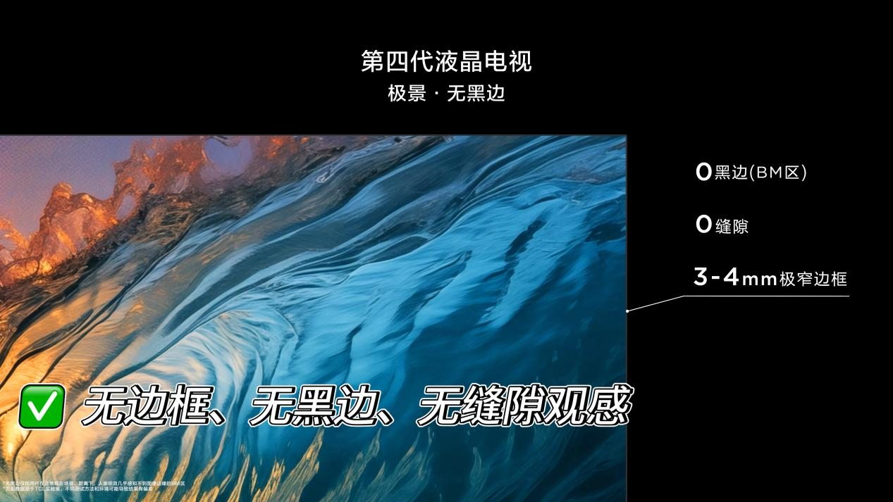 回顾过往我们看过的液晶电视你会发现,无论是黑边、边框亦或是缝隙的“存在感”都非常强,比如第一代的液晶电视,拥有30mm的超厚边框,而来到第二代液晶电视边框和黑边依旧分别有10mm,截至10日前的第三代虽然已经采用了主流的全面屏设计,但还是会有2-5mm的边框,影响观影体验和颜值。而TCL在22项专利技术的支撑下,首创了“无边框、无黑边”视觉的极景·无黑边设计,达成了第四代液晶电视无黑边的形态创造。