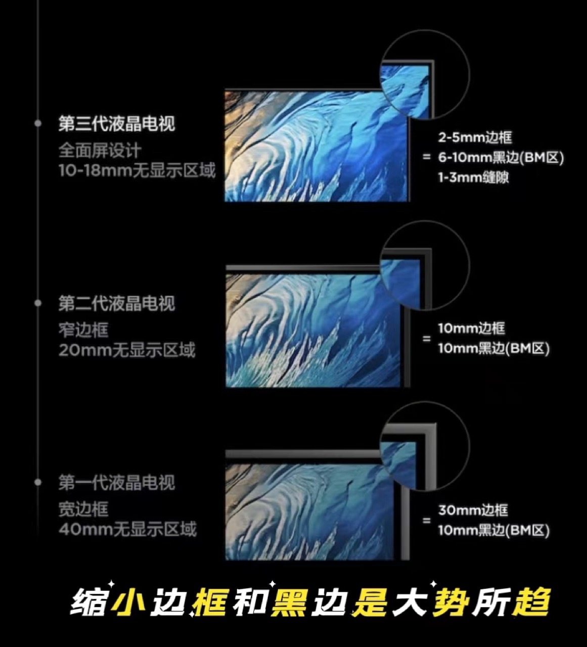 事实上这种屏幕进化也不是一蹴而就,回顾液晶电视的发展史,其实能发现电视厂商一直在缩小屏幕上非显示画面的比例(即边框与黑边),从第一代的“超宽边框”到第二代的“超窄边框”,再到2016年的第三代液晶电视将边框缩小到2-5mm,但仍有黑边和缝隙。本质上,这一切屏幕形态进化的出发点都是为了让用户的画质体验更上一层楼,就像TCL Q10L系列通过外观升级,缩小边框来提高观影的沉浸感,无黑边的设计提升了屏幕边缘的亮度均匀性,具备更佳的色彩广视角。可以说,业界在经过长达10年的瓶颈期后,今年TCL推出的第四代液晶电视Q10L系列才终于在这条赛道上带来新的突破。