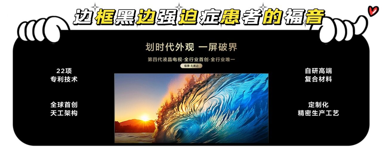 可能你会疑惑,难道其他品牌没有做相似的设计吗?很可惜的是,就目前来说TCL的这项技术确实是行业独一份,毕竟这种屏幕升级背后往往需要海量技术支撑,以及大量科研投入!据官方透露的消息,"极景・无黑边"这项技术是以全球首创的天工架构和22项专利作为技术支撑,从架构设计、定制材料到生产工艺进行全链路升级,并历时数年的技术攻关,最终才得以实现!值得高兴的是,如今液晶电视行业也正式迈入了真·全面屏时代,作为有一点强迫症的观众,我也期待未来行业拥有更多第四代液晶电视产品!