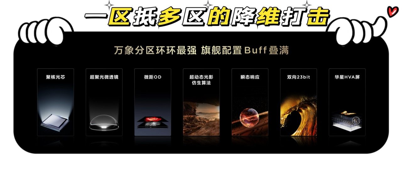 不仅如此,这次在画质升级上,TCL的万象分区技术可以说是最佳C位,与蝶翼华曜屏强强组合,将Mini LED画质推向新的巅峰。不同于传统分区技术,万象分区是一整套完整的、全链路的系统性光学解决方案,从Mini LED电视背光到成像显示的全链路7大环节进行技术突破,从而实现高效的分区控光,,实际控光效果是普通分区的数倍,堪称降维打击。