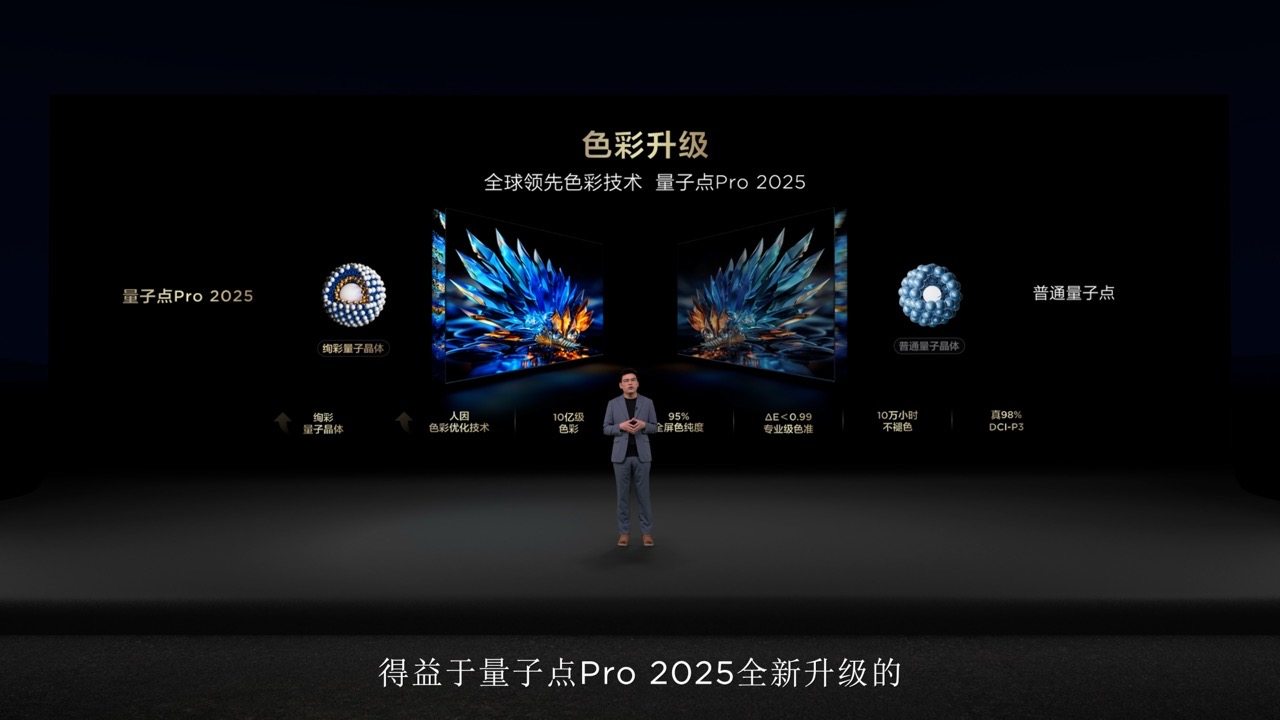 除了分区,亮度也是消费者选购Mini LED电视时最关心的指标之一。T7L Pro系列将XDR 1600nits升级为绚彩XDR 2200nits,不仅峰值亮度提升,而且亮得更持久、亮得更出彩、亮得更护眼。色彩方面也由量子点Pro 2024升级为最新的量子点Pro 2025,从量子点材料到色彩算法全面升维,实现真·98%DCI-P3超高色域,让显示画面更真实地还原现实世界,真正做到十亿原色屏,十年好色彩。