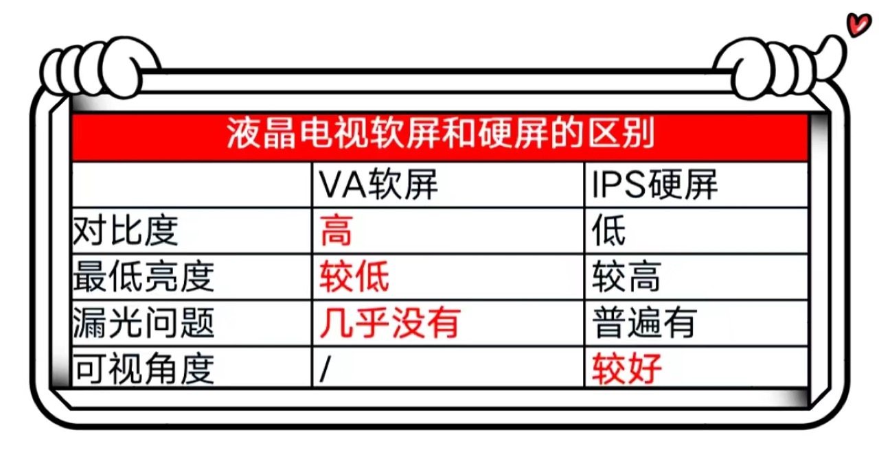 其实很多人在选购电视时连屏幕的类型都不太了解,但事实上屏幕类型是决定画面表现的核心因素之一。目前主流产品的电视屏幕分为两种:软屏(VA屏)和硬屏(IPS屏),这两者在性能上面的差距各有千秋。IPS硬屏的优势在于可视角度广,但对比度较低,易出现光晕问题;而软屏的对比度更高,拥有更佳的广色域,遮光能力更强,画面色彩更鲜艳。对于追求高画质的朋友,选电视的时候建议擦亮眼睛,首选一定选软屏!