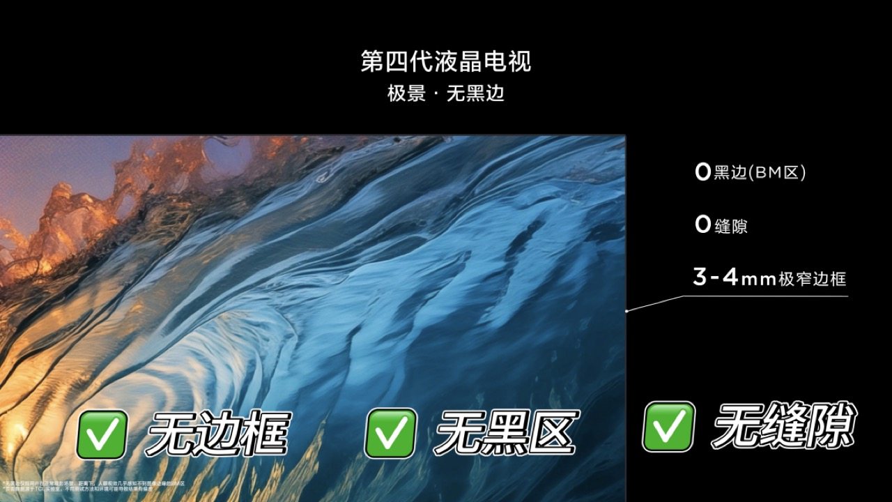 时至今日,液晶电视的屏幕外观早已经历了多次迭代,从超宽边框到窄边框,再到全面屏,但屏幕边框和黑边的问题始终存在。而如今TCL用行业首创的"极景・无黑边"技术彻底终结了屏幕边框黑边的时代,凭借22项专利技术和全球首创的天工架构,从架构设计、定制材料到生产工艺全链路升级,成功实现了“无黑边、无边框、无缝隙”的视觉效果,更是让电视的可视面积近乎达到100%(前三代液晶电视最高仅达到97%),带来第四代液晶电视的行业级革新。