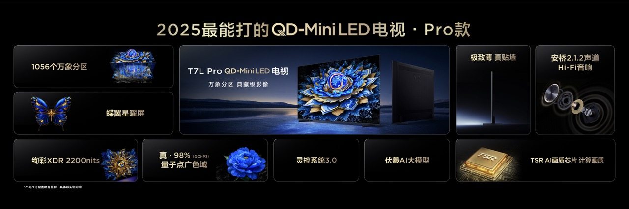 为了不辜负大家的期待,TCL也是卯足了劲,这次的T7L Pro系列和Q9LPro系列一口气搭载了蝶翼星曜屏、万象分区、量子点Pro 2025等一系列黑科技,要知道,这此前可是万元旗舰级的专属技术,现在全部下放可见诚意满满。