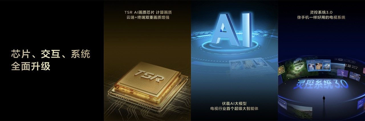 除了上述的史诗级升级外,T7L和Q9L系列还有更多惊喜亮点,比如,在音效上,从2.1声道Hi-Fi音响升级为安桥2.1.2声道Hi-Fi音响,音质更立体,低音更震撼;在芯片上,从TXR Mini LED画质增强芯片升级为TSR AI画质芯片,智能优化电视画质,让普通片源秒变4K大片,以及还有伏羲Al大模型的加入,让电视懂你所需,主动服务等等。可以说,从画质、音效再到操控全方位升级,主打一个全能型选手!