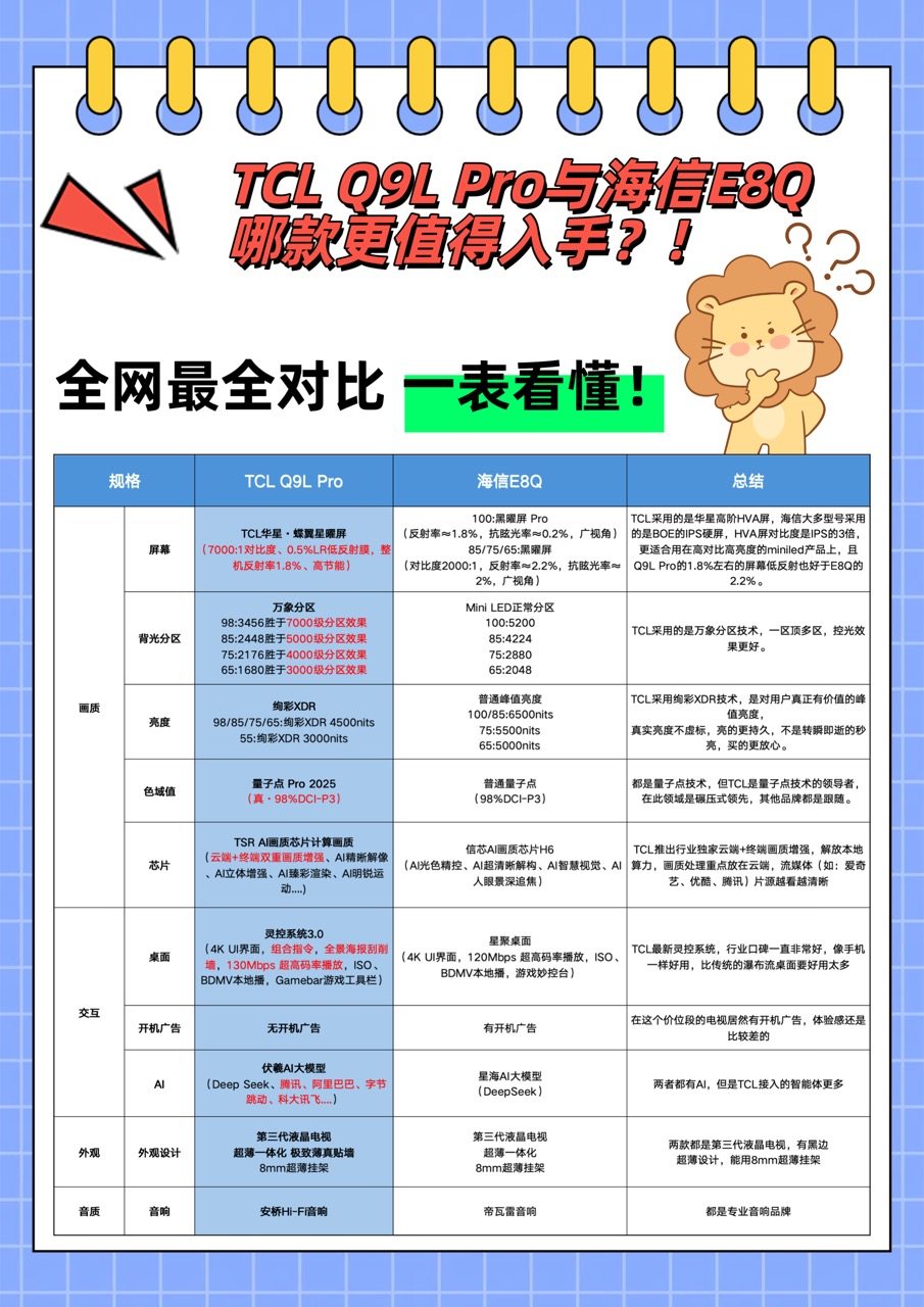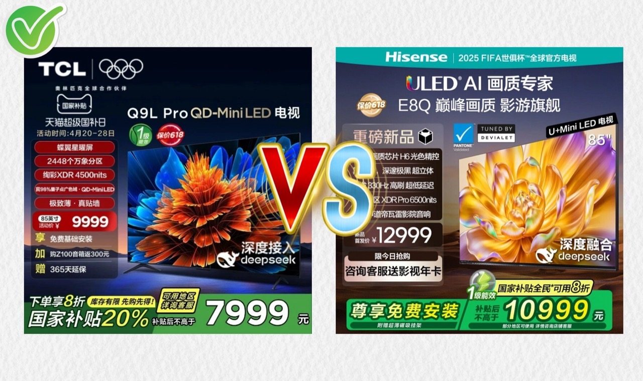 而且在这个预算段里,真正能打的85吋大屏其实就那么几款,像最近热度挺高的TCL Q9L Pro和海信E8Q,不少人都拿它俩反复对比。那么问题来了,真要从这两台里选,到底该怎么挑?咱们今天就拆开说说——从屏幕素质、控光逻辑、亮度表现到系统体验,逐项过一遍,看看到底谁更值得冲!